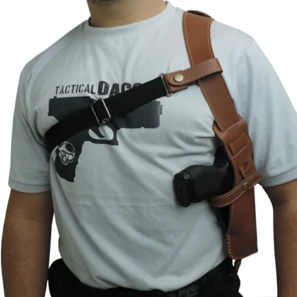 Confeccionado em couro bovino Possui costuras reforçadas Fechamento por botão de pressão Serve em todo tipo de pistolas até 6' Revolver todos até 4'