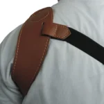 Confeccionada em couro, com largura de 25mm. Possui descanso fixo para o ombro tornando-a mais confortável. Fixada na arma por duas pontas com sistema tipo estrangulador. Compatível com qualquer arma que tenha zarelhos na coronha e handguard.